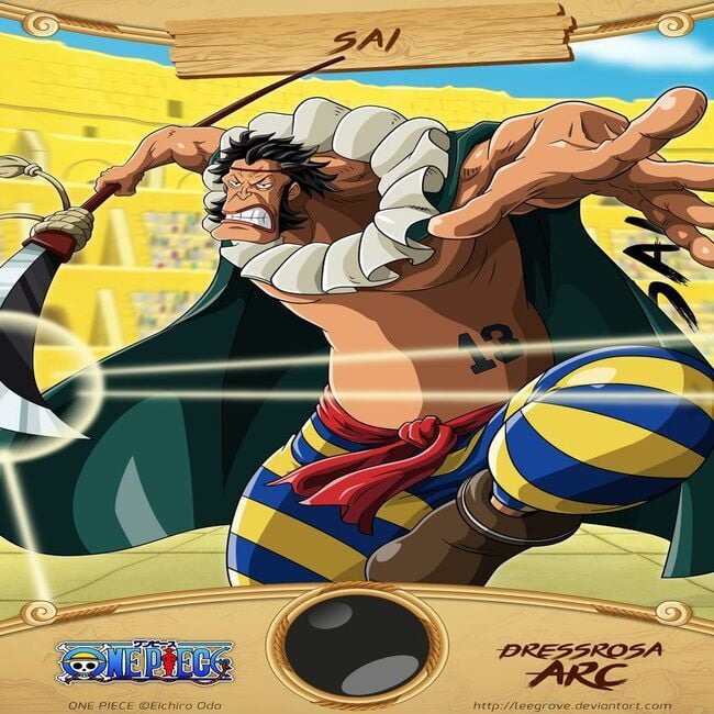 This is Sai, a fictional character, the 13th generation leader or current leader of the Eight Treasures Marines in the One Piece manga.